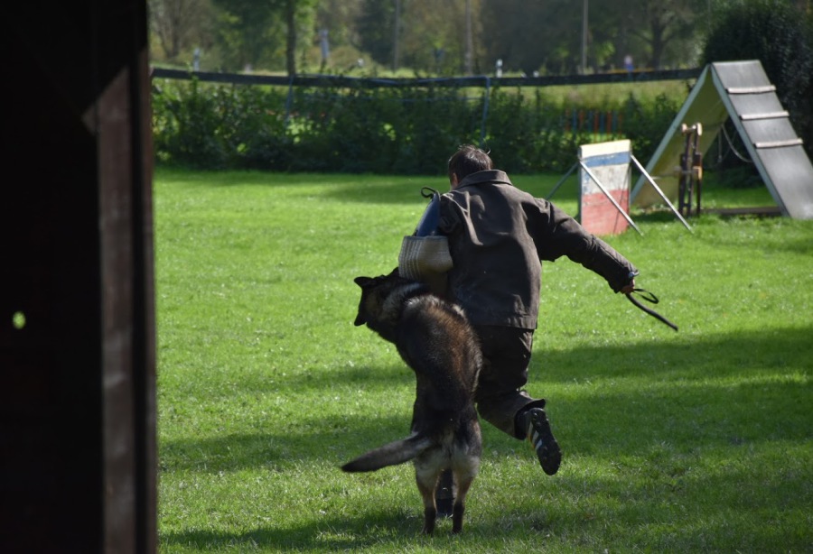 Hier flieht der Helfer (Scheintäter) vor dem Hund und dieser soll die Flucht vereiteln. Selbstverständlich möchte unser Hund nur den Schutzarm (seine Beute) und nicht den Helfer! Das lernt der sportliche Schutzhund.