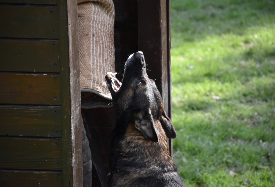 Dieser Hund hat glernt, dass er nur über den Gehorsam seine Beute (Schutzarm) erhält. Verbellen (Stellen des Scheintäters) ist das Ziel. Er darf den "Täter/Helfer" nicht beißen, ihm nicht den Schutzarm streitig machen oder bedrängen und lernt, dass er seine Beute als Belohnung nur erhält, wenn er das von uns gewünschte Verhalten zeigt.